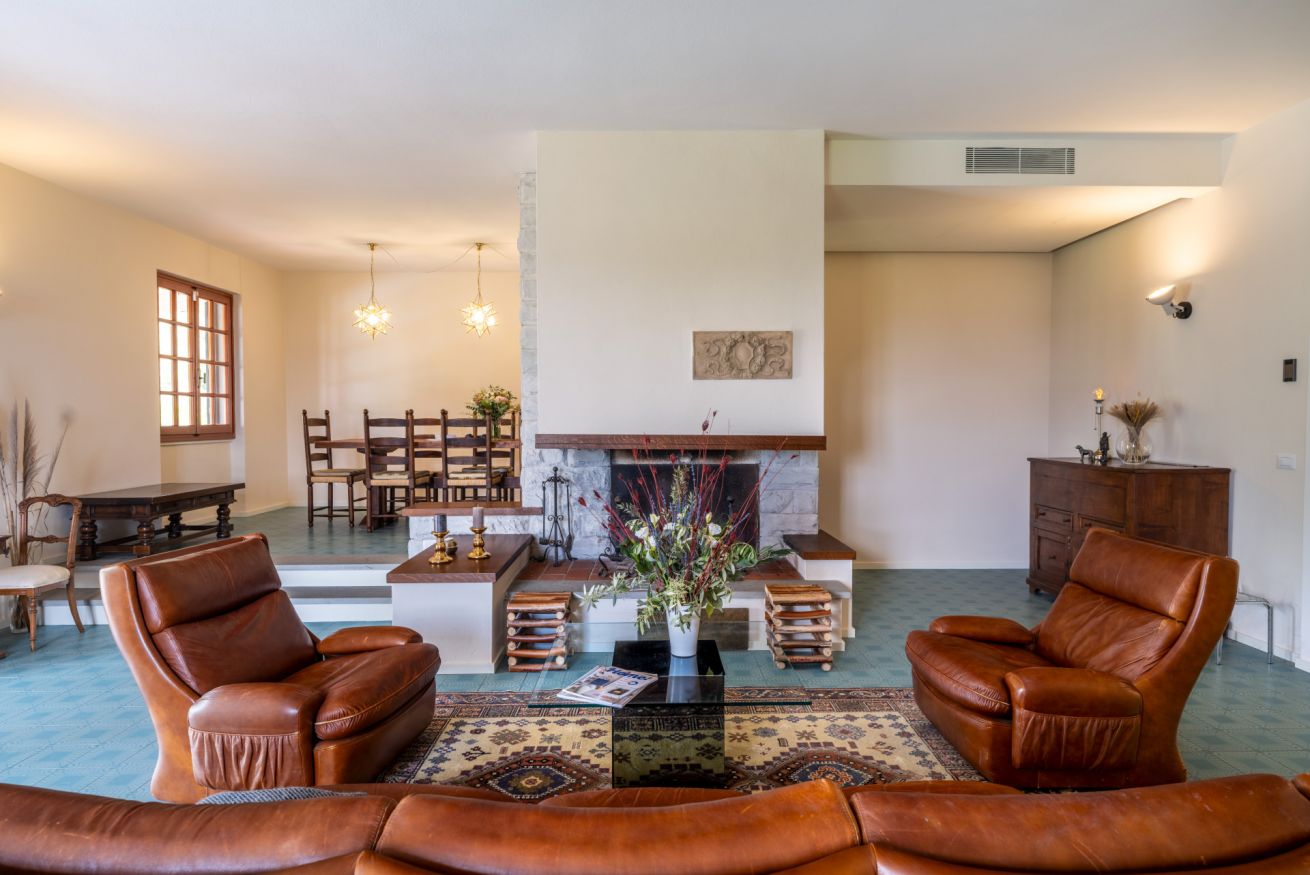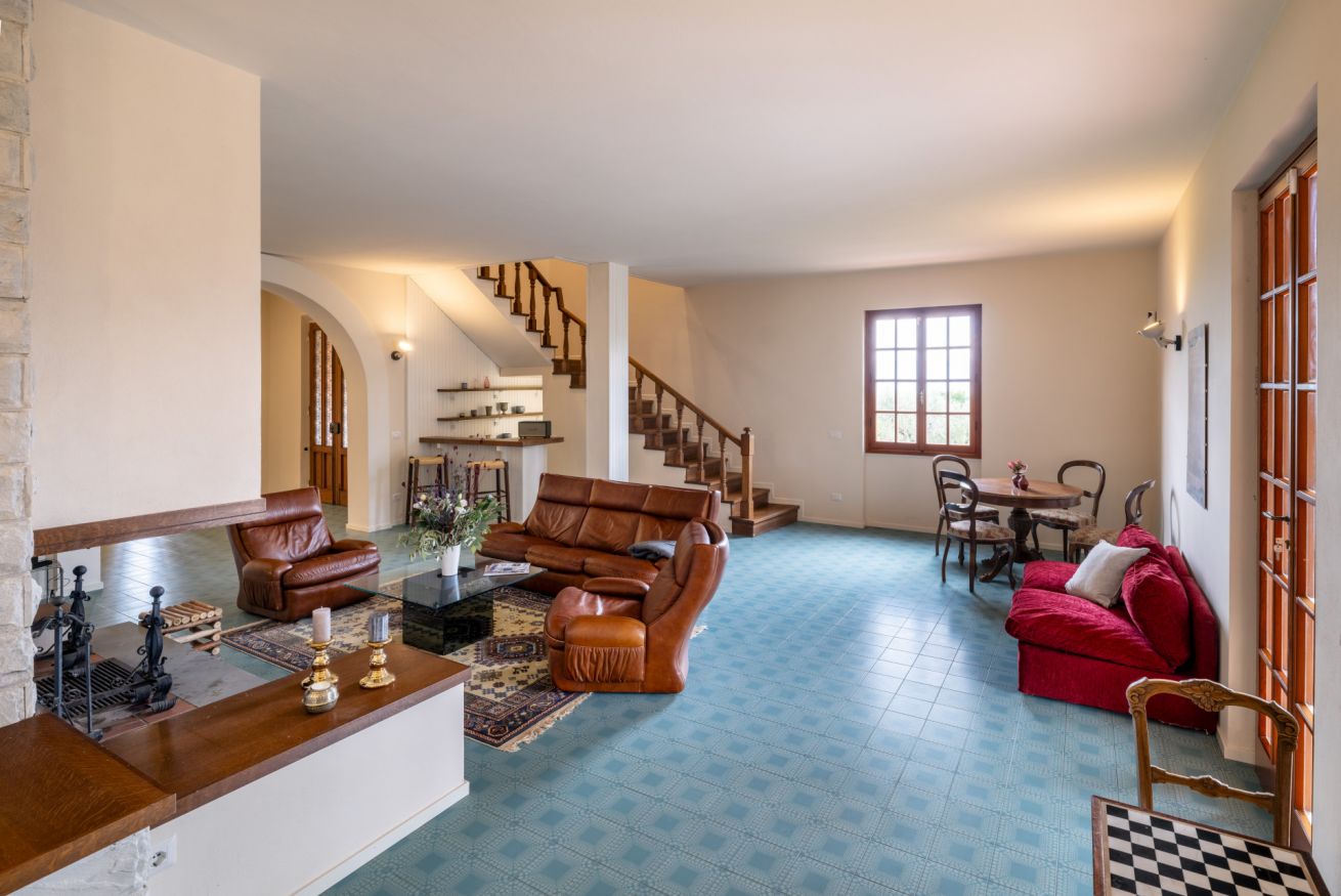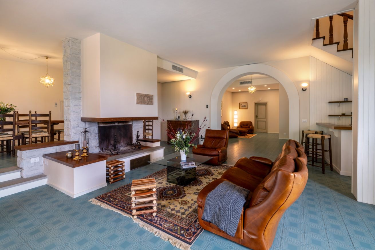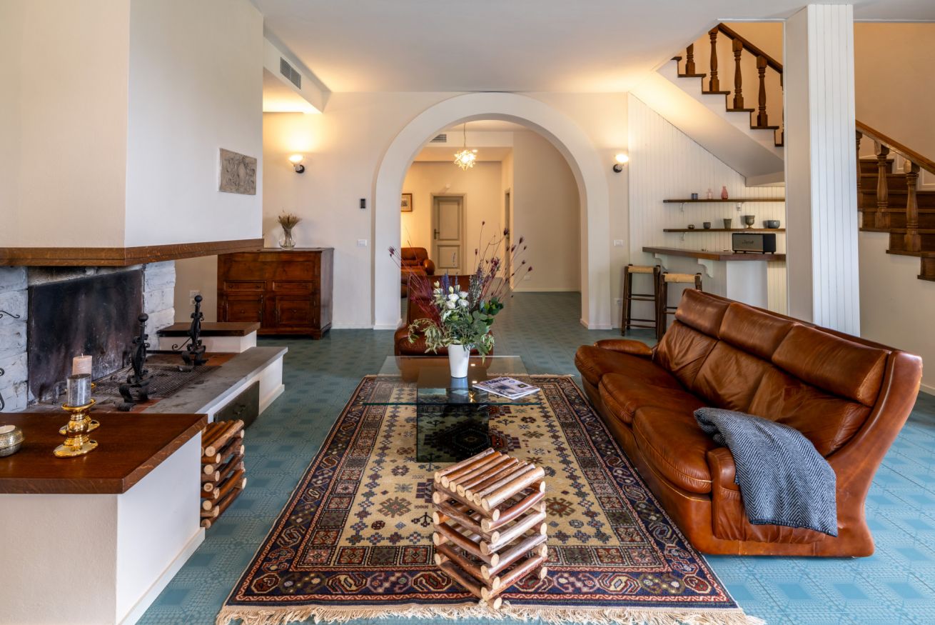 Una volta entrati nella villa, sarete immediatamente colpiti dall'eleganza e dalla raffinatezza degli interni. Il piano terra accoglie gli ospiti con un ampio soggiorno, caratterizzato da un accogliente caminetto che crea un'atmosfera di intimità e calore. Accanto al soggiorno, una sala relax offre uno spazio dedicato al riposo e al relax, ideale per trascorrere momenti di tranquillità. Un bagno finemente arredato completa il piano terra, offrendo ogni comfort.
