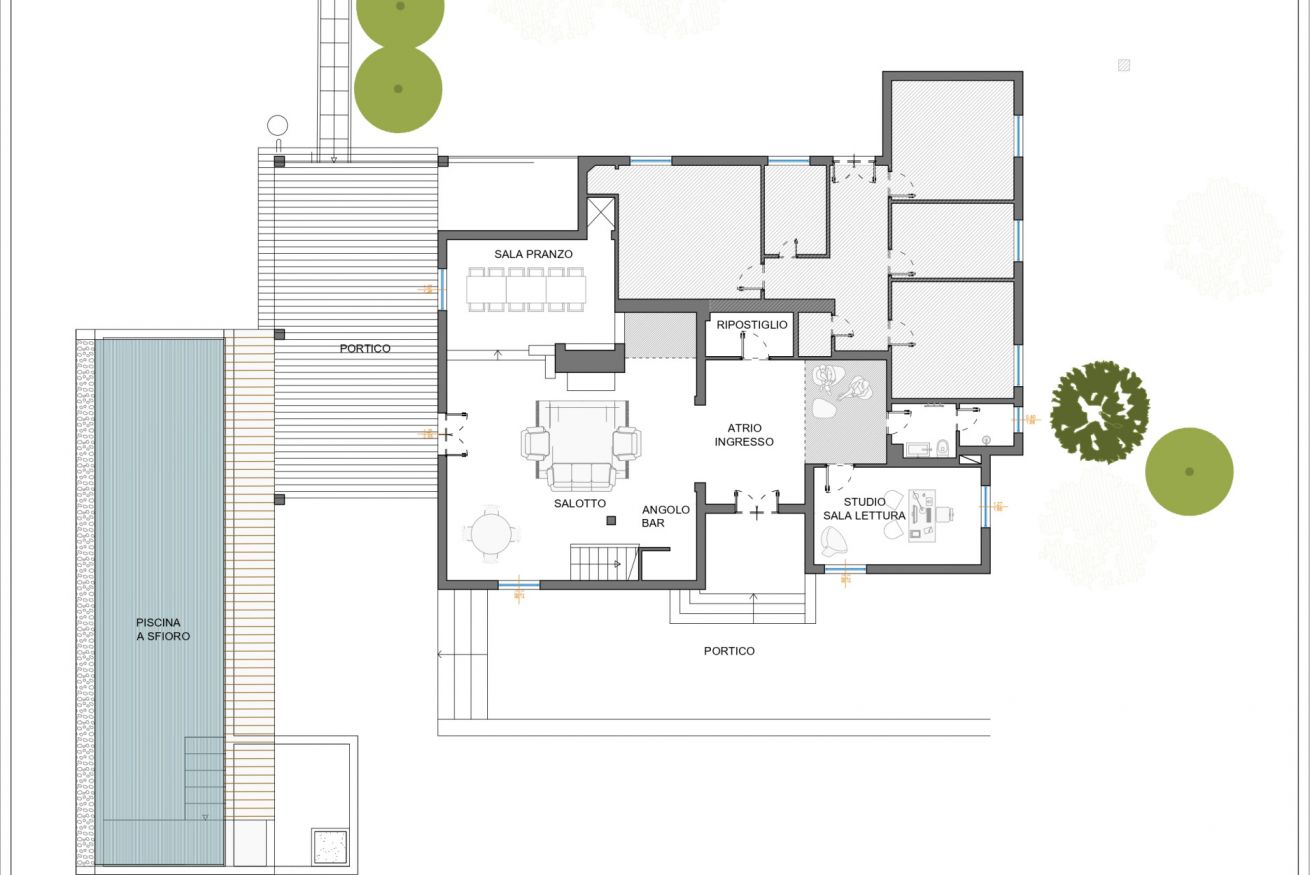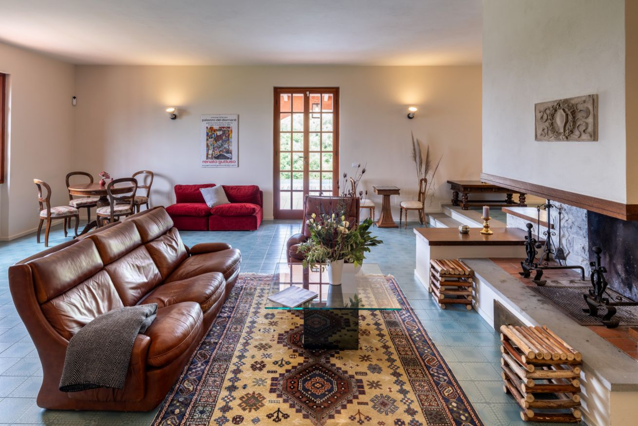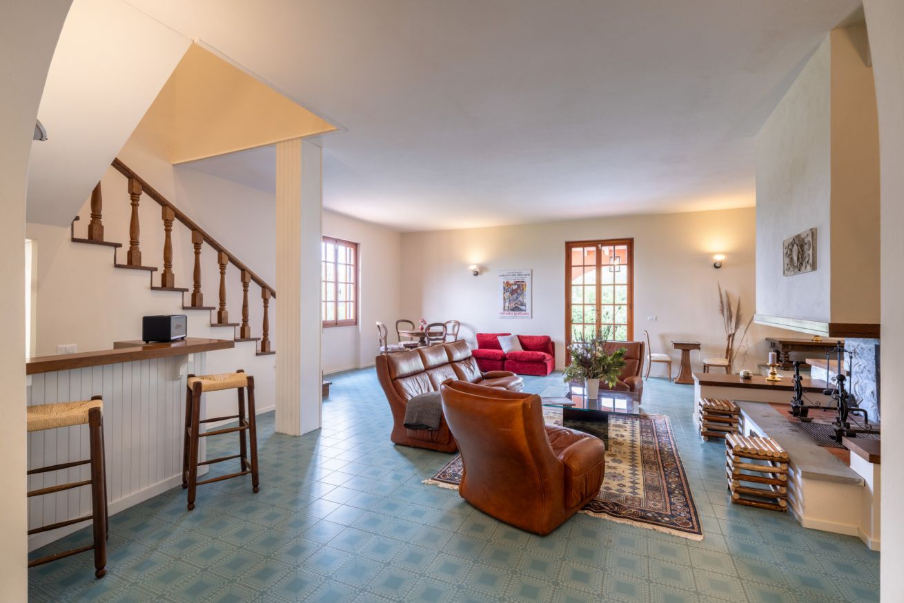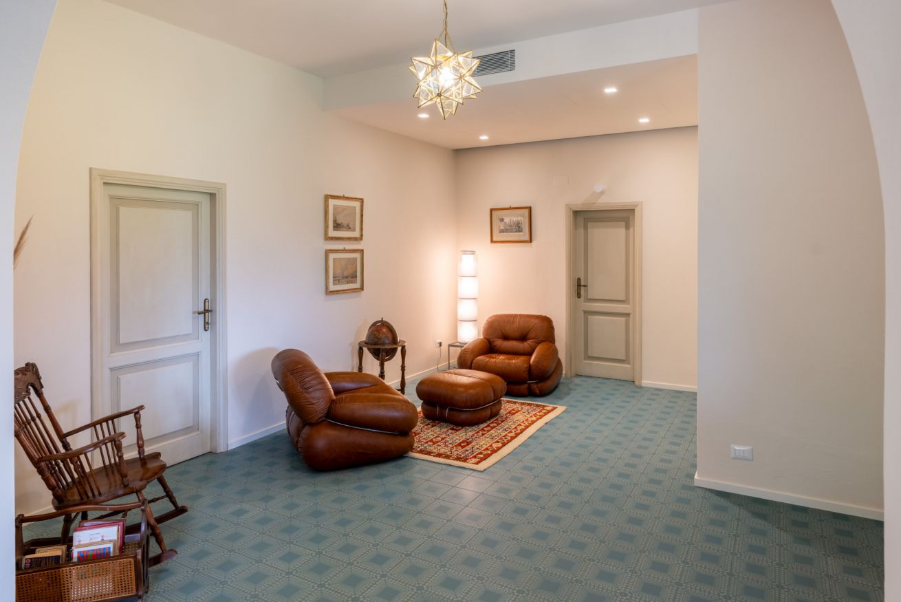 Una volta entrati nella villa, sarete immediatamente colpiti dall'eleganza e dalla raffinatezza degli interni. Il piano terra accoglie gli ospiti con un ampio soggiorno, caratterizzato da un accogliente caminetto che crea un'atmosfera di intimità e calore. Accanto al soggiorno, una sala relax offre uno spazio dedicato al riposo e al relax, ideale per trascorrere momenti di tranquillità. Un bagno finemente arredato completa il piano terra, offrendo ogni comfort.