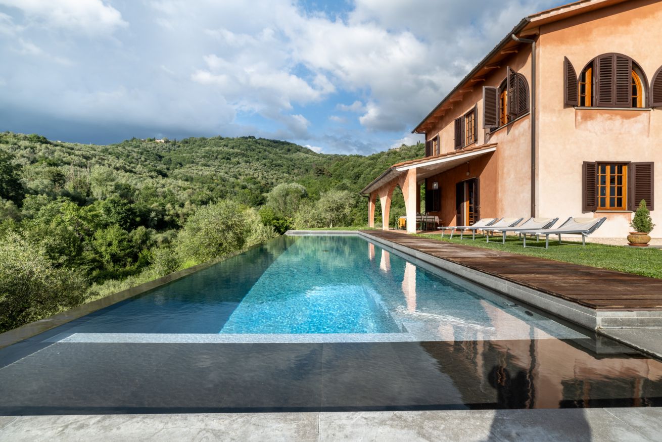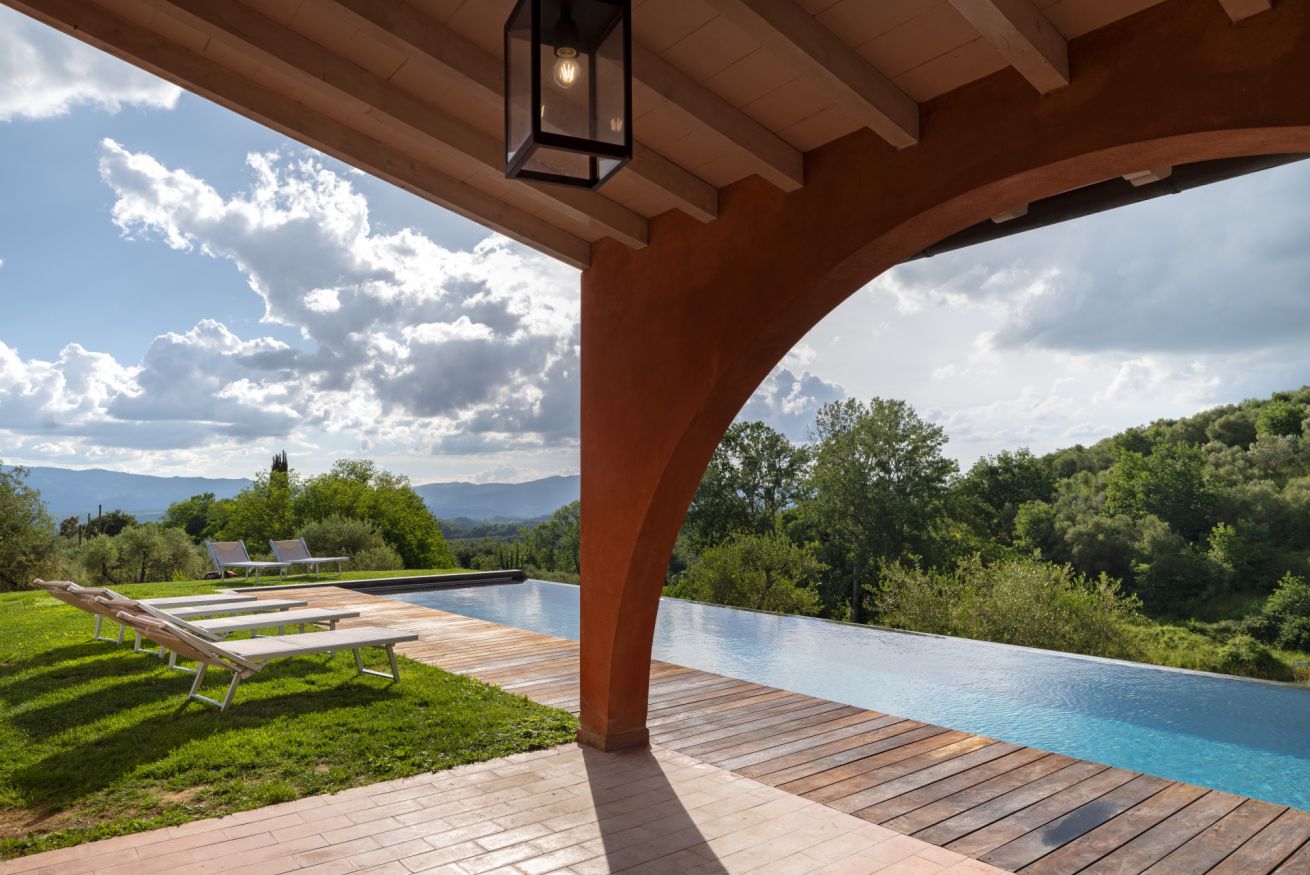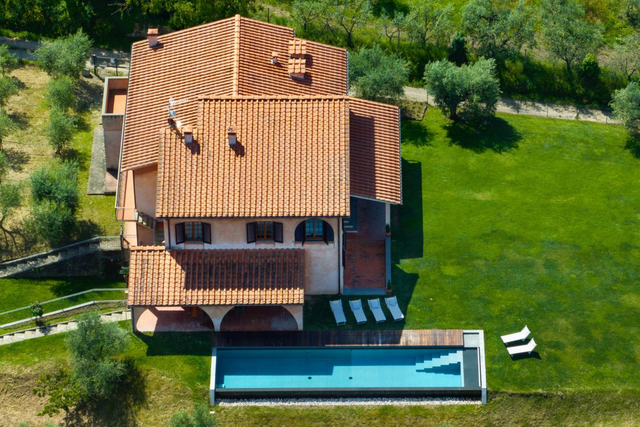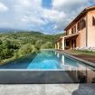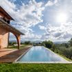 All'arrivo, sarete accolti da un incantevole giardino che circonda la villa, offrendovi un ambiente rigoglioso e rilassante. Un ampio spazio parcheggio vi accoglie, garantendo comodità e praticità per gli ospiti. Al centro del giardino, una splendida piscina a sfioro si staglia con grazia, offrendo una vista spettacolare che si perde tra le colline circostanti. Ombrelloni e lettini invitano a godersi il dolce tepore del sole mentre ci si rilassa a bordo piscina.