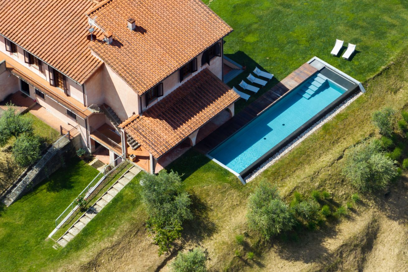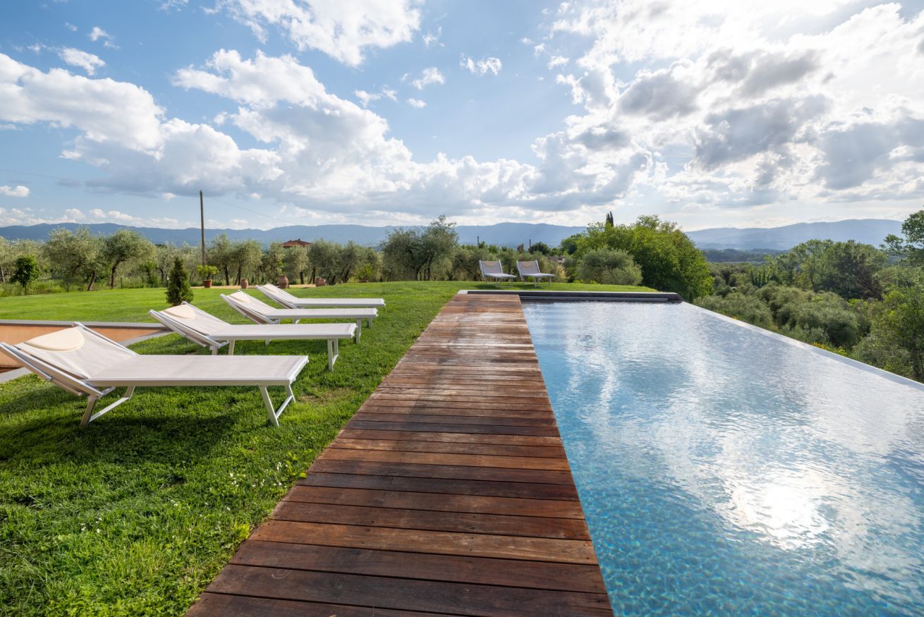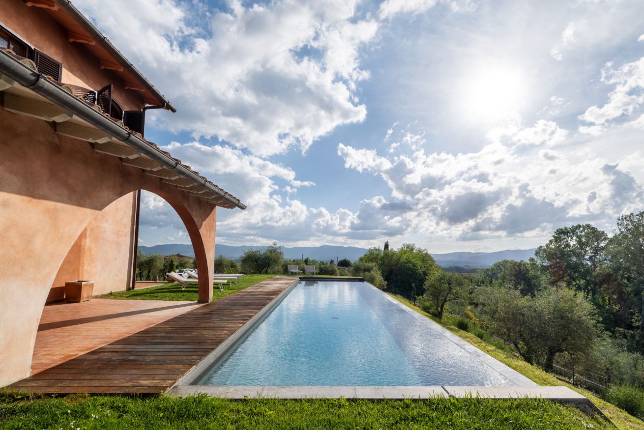 All'arrivo, sarete accolti da un incantevole giardino che circonda la villa, offrendovi un ambiente rigoglioso e rilassante. Un ampio spazio parcheggio vi accoglie, garantendo comodità e praticità per gli ospiti. Al centro del giardino, una splendida piscina a sfioro si staglia con grazia, offrendo una vista spettacolare che si perde tra le colline circostanti. Ombrelloni e lettini invitano a godersi il dolce tepore del sole mentre ci si rilassa a bordo piscina.