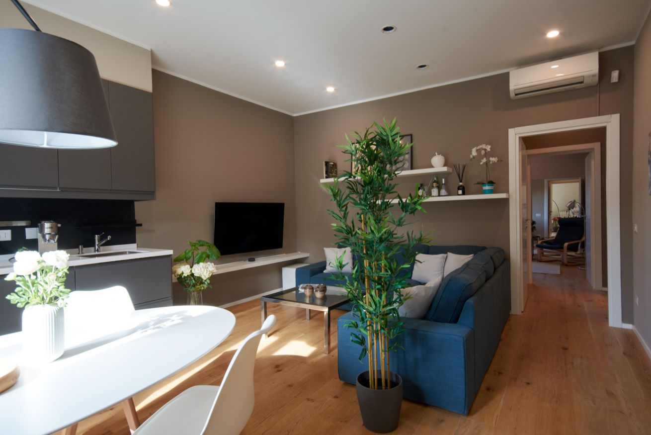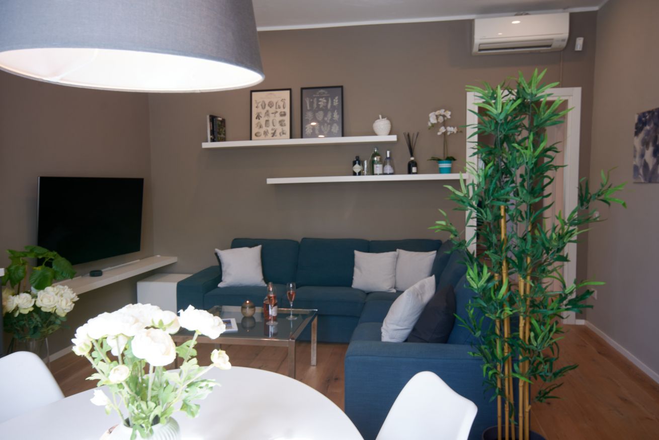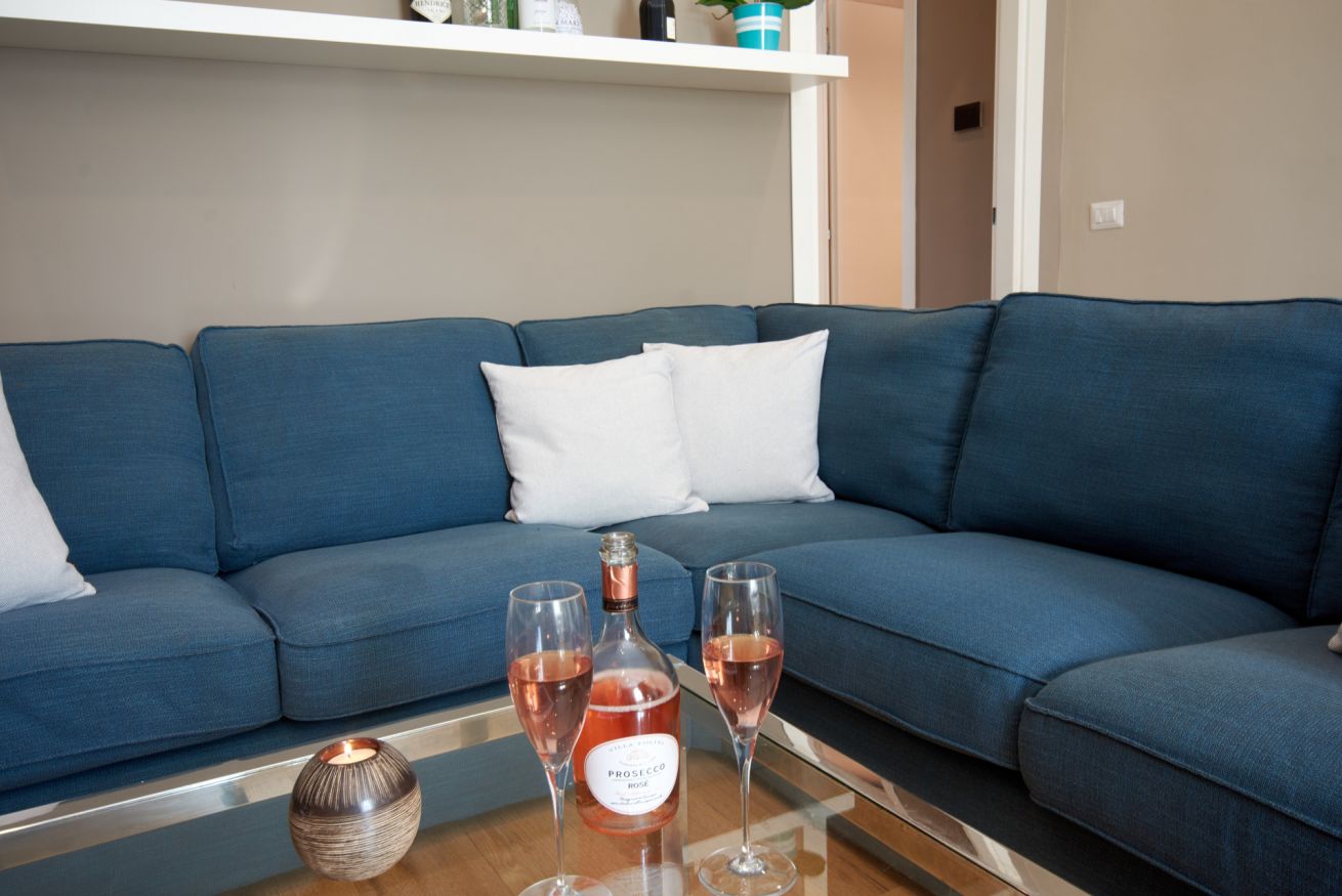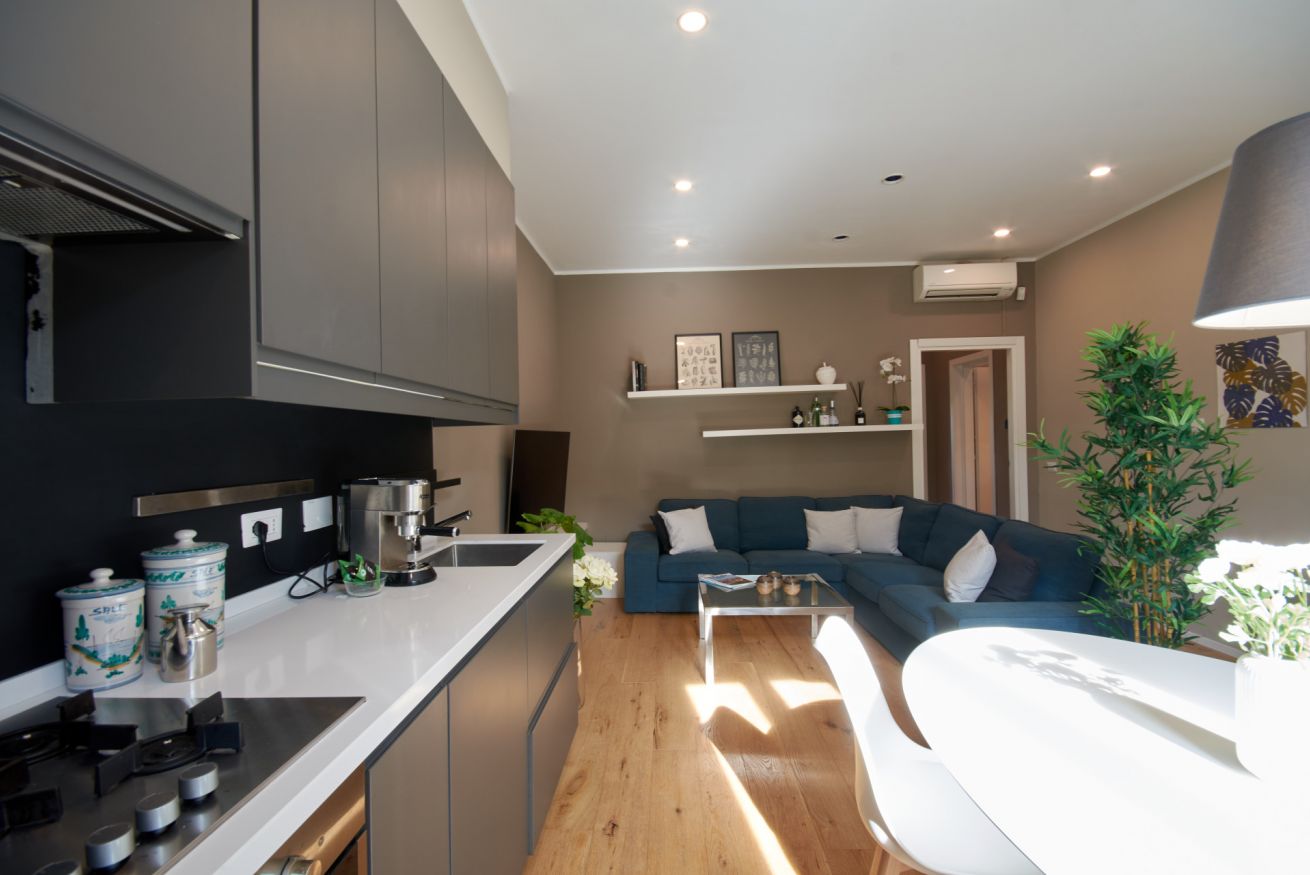 L'appartamento è stato finemente ristrutturato e offre un'atmosfera calda ed accogliente. Il pavimento in parquet conferisce eleganza e charme a tutti gli ambienti. L'ampio soggiorno con cucina a vista è il luogo ideale dove trascorrere del tempo in compagnia, con un comodo divano angolare e una TV 55" per godersi i momenti di relax. La cucina è completamente attrezzata e dotata di tutti gli elettrodomestici per cucinare comodamente in casa.
