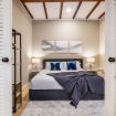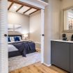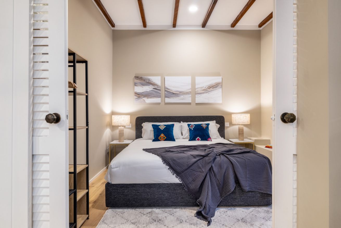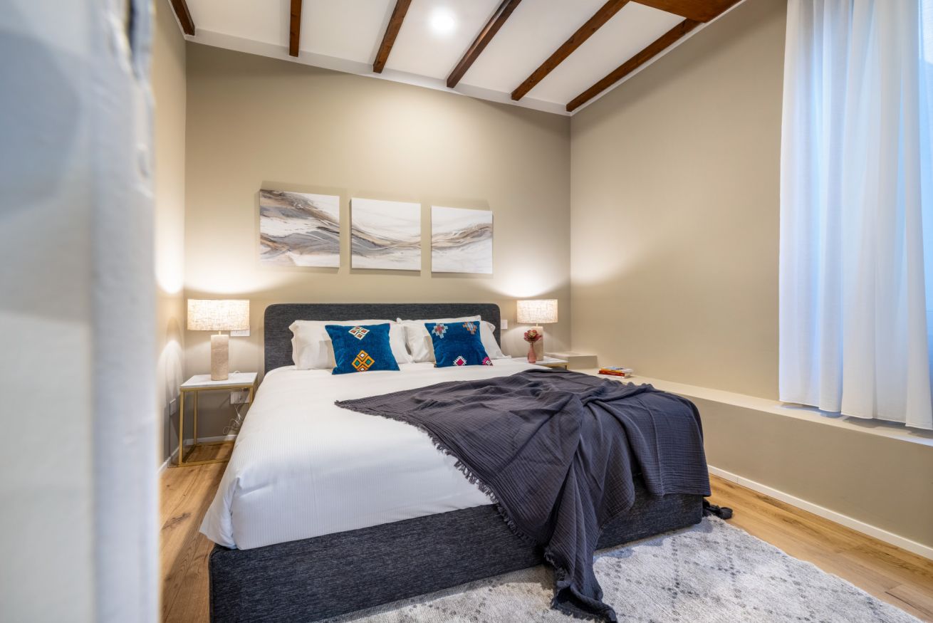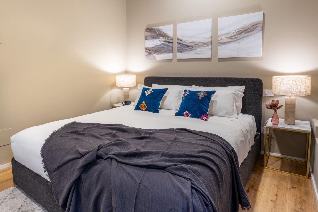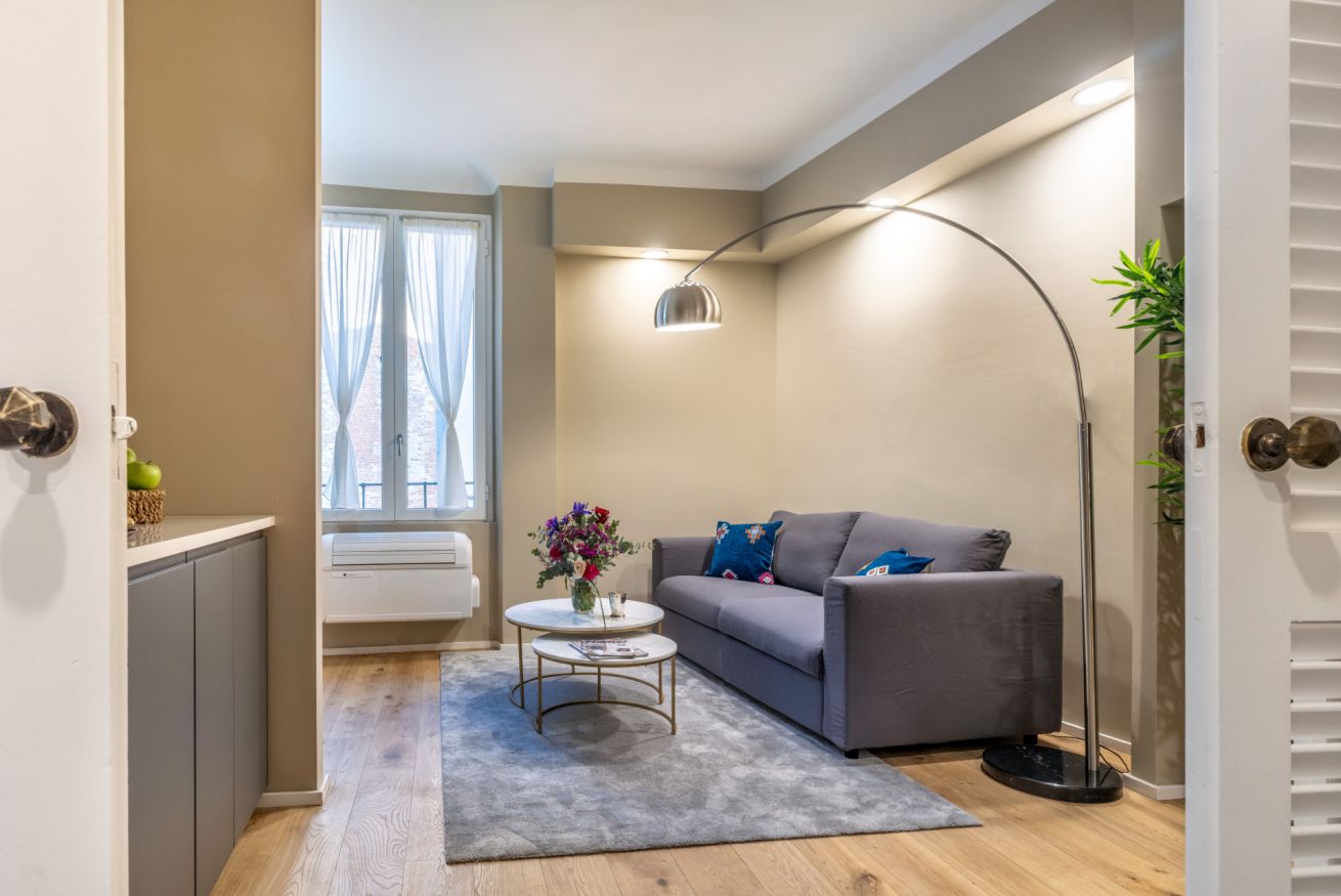 La camera da letto è dotata di un comodo letto king-size (180x200), mentre il soggiorno, arredato con gusto essenziale e contemporaneo, dispone di un divano letto per un ulteriore comfort. Il parquet aggiunge un tocco di calore ed eleganza agli spazi.