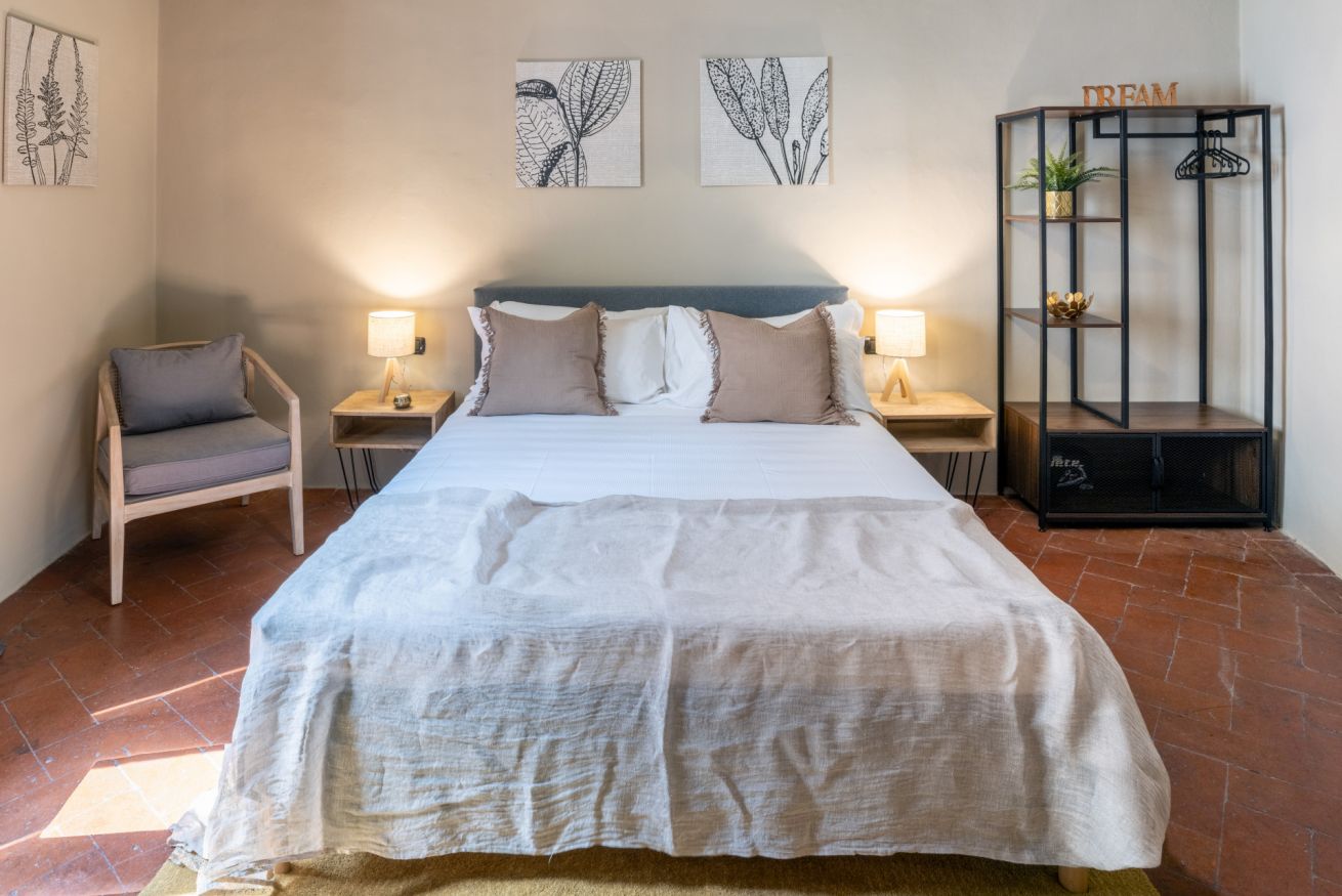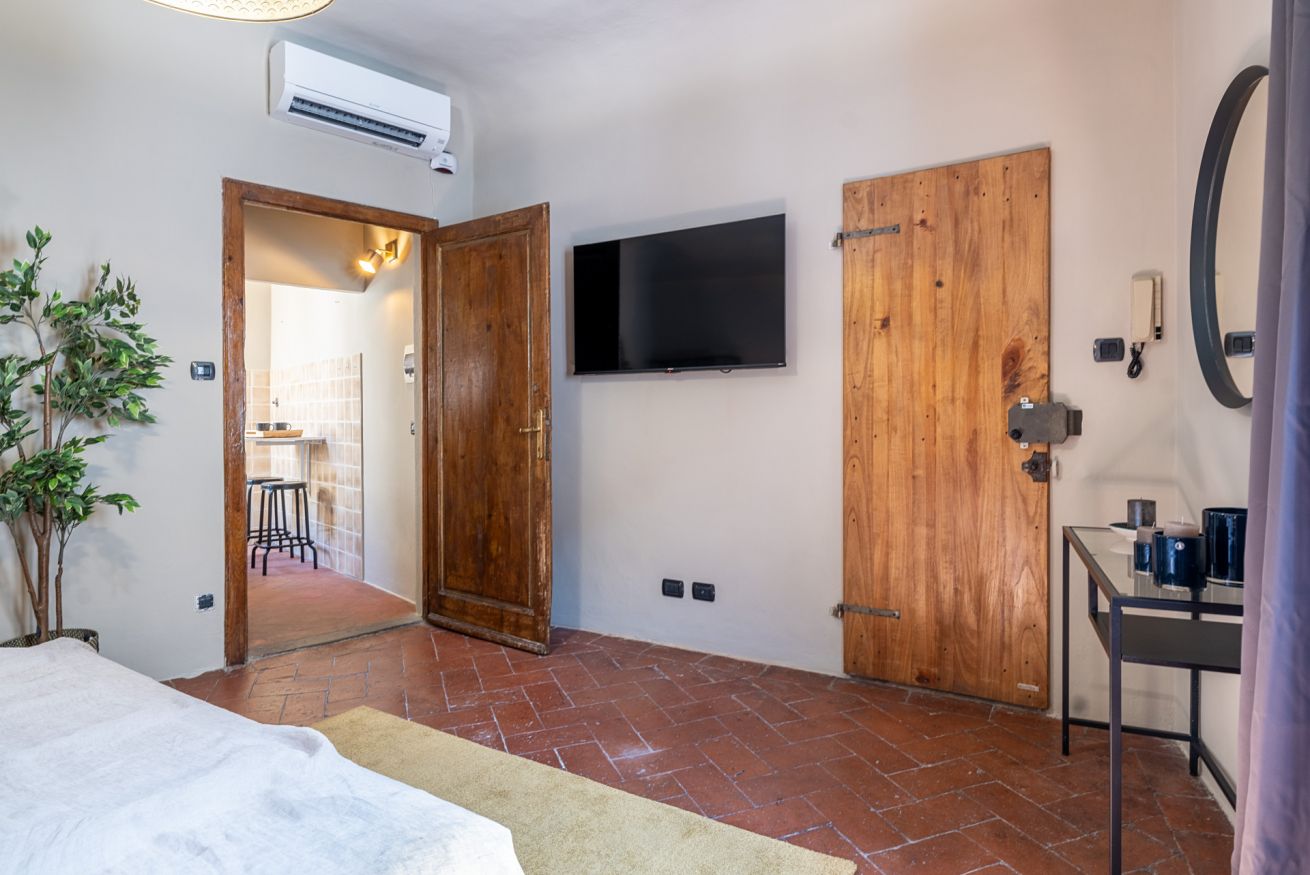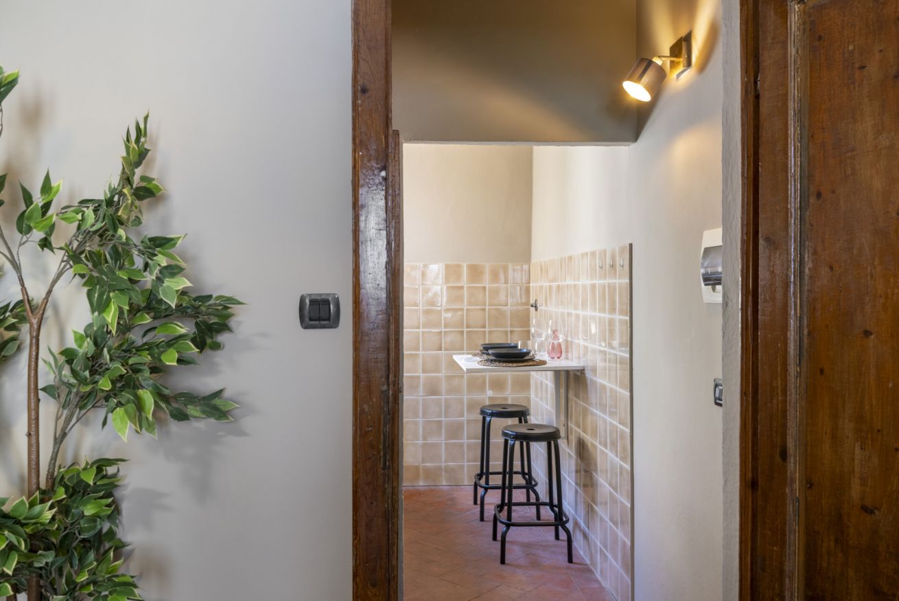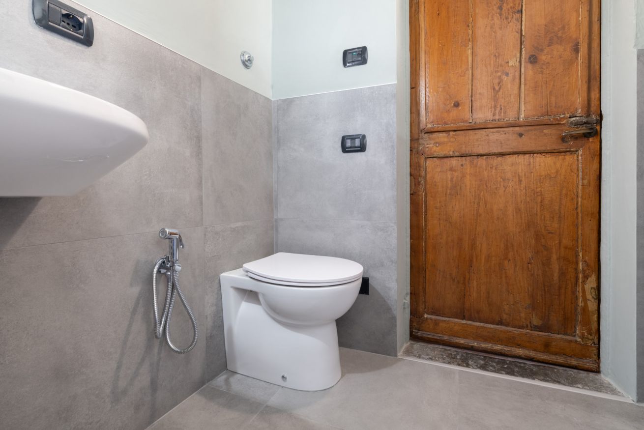 Il bagno è moderno e funzionale, mentre la ristrutturazione ha mantenuto intatto il pavimento in cotto antico tipico toscano, conferendo all'ambiente un'atmosfera calda e autentica.