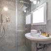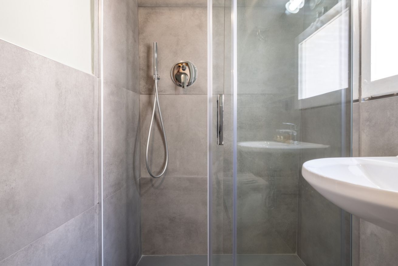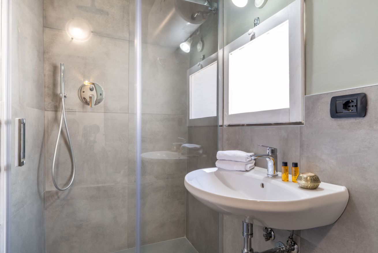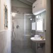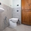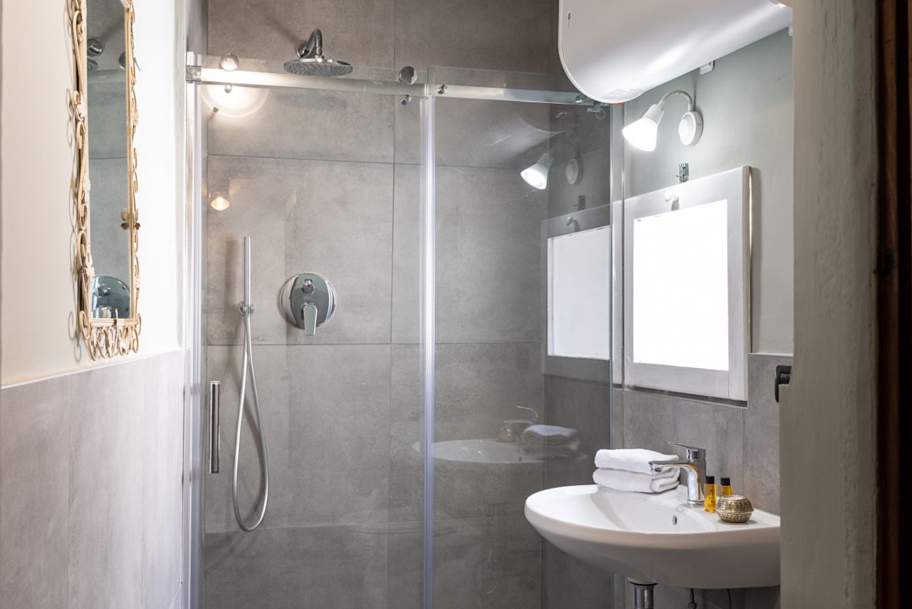 Il bagno è moderno e funzionale, mentre la ristrutturazione ha mantenuto intatto il pavimento in cotto antico tipico toscano, conferendo all'ambiente un'atmosfera calda e autentica.